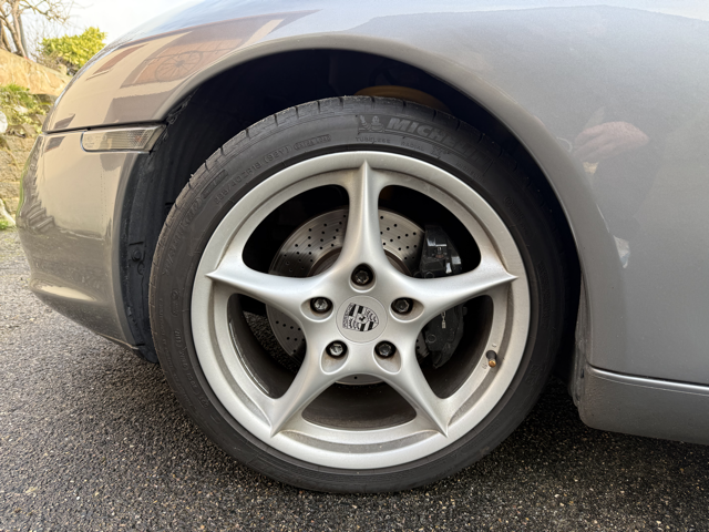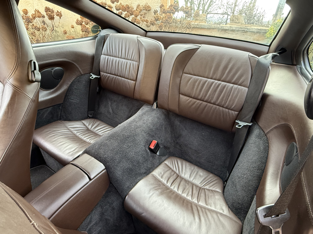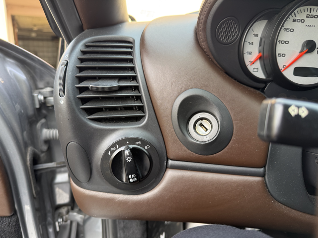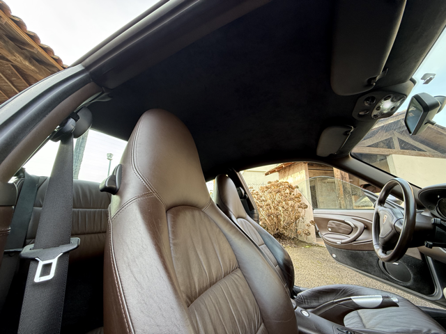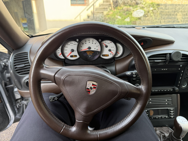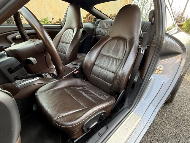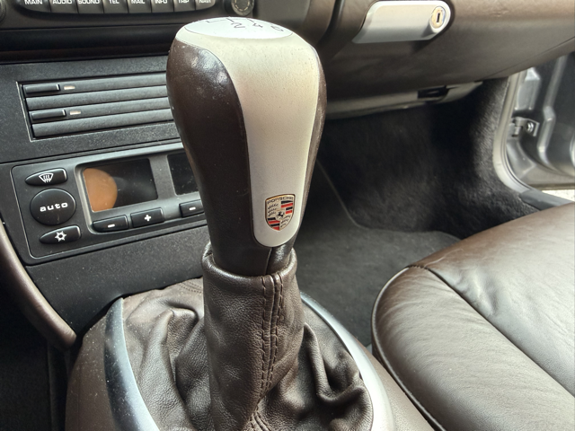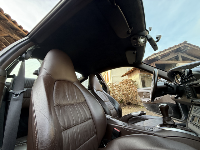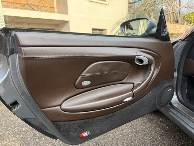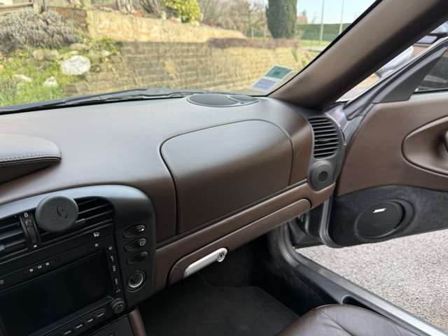 Cet exemplaire se distingue par une configuration Porsche Exclusive (code 99) particulièrement rare, combinant une élégante teinte extérieure Gris Kerguelen métallisé à un somptueux intérieur entièrement en cuir brun “Hirschbraun”, avec cuir étendu sur le tableau de bord, les contre-portes et la console centrale. Une configuration haut de gamme, raffinée et très peu courante sur 996, destinée à une clientèle passionnée et avertie.